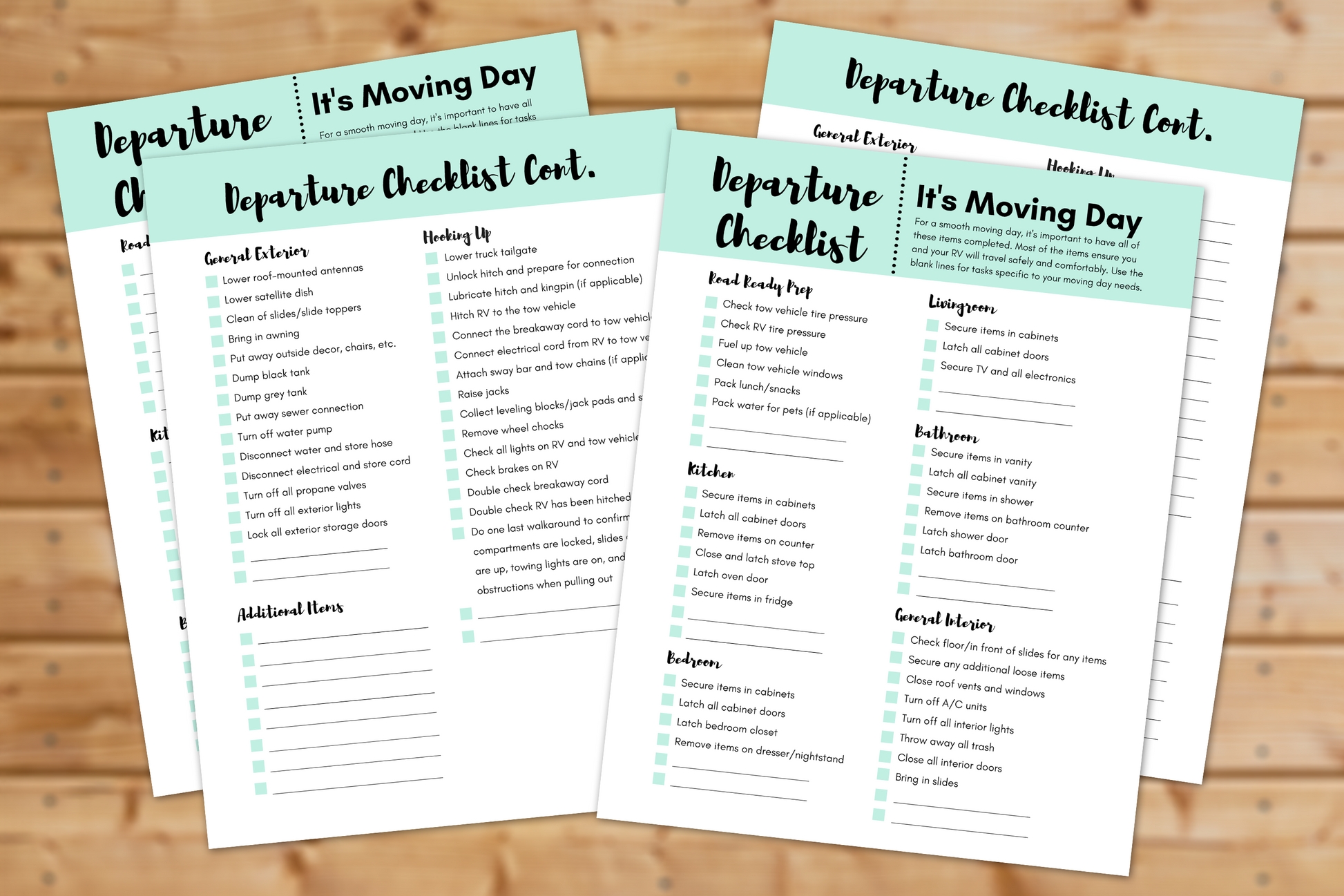 Save yourself the headache and financial burden from making any of these mistakes with the RV Departure Checklist. This four page PDF includes a detailed checklist and a blank checklist. Use the detailed checklist to mark tasks done in every room in the RV as well as all exterior tasks. Use the blank checklist to create your custom list with all of the tasks that apply to your moving day needs.